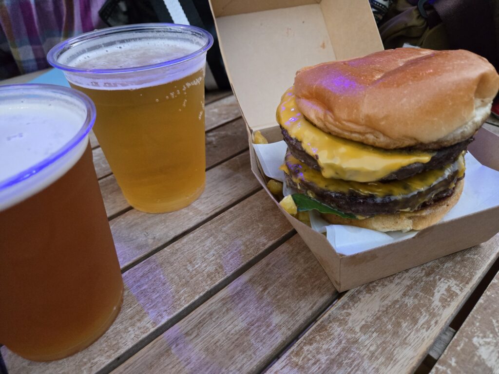 「ビール」(各1,500円)と「ダブルスパークバーガーセット」(3,030円)で万博価格で高いですが、かなり美味しかったので満足♪