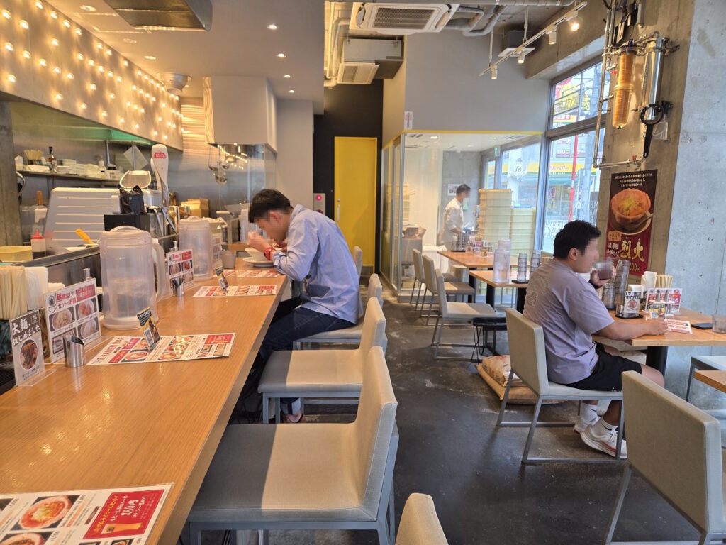 カウンターとテーブル席の店内はガラス張りのおかげで明るくオシャレで、清潔感もあってGOOD。奥に製麺室が見えます。