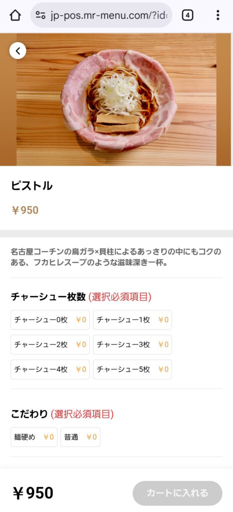 ラーメンの種類、チャーシューの枚数、こだわり、トッピング等を選択する形式で、初めてなので定番の「ピストル(チャーシュー5枚、普通)」(950円)を注文。