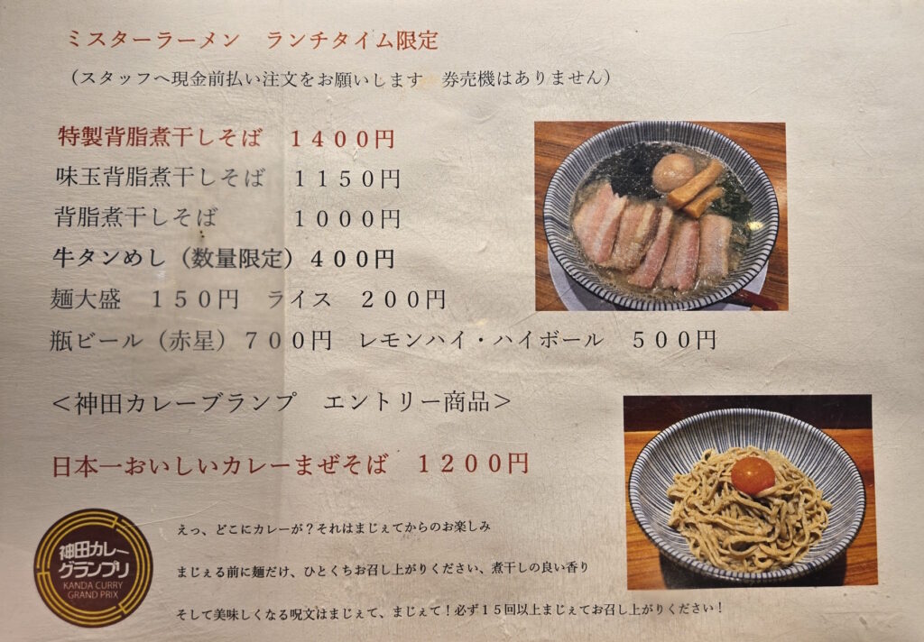 「カレーまぜそば」はなかなか珍しいジャンルですが、コダワリも感じられて美味しかったので、今度は夜の「ミスター焼肉」にも訪問してみたいと思いました。