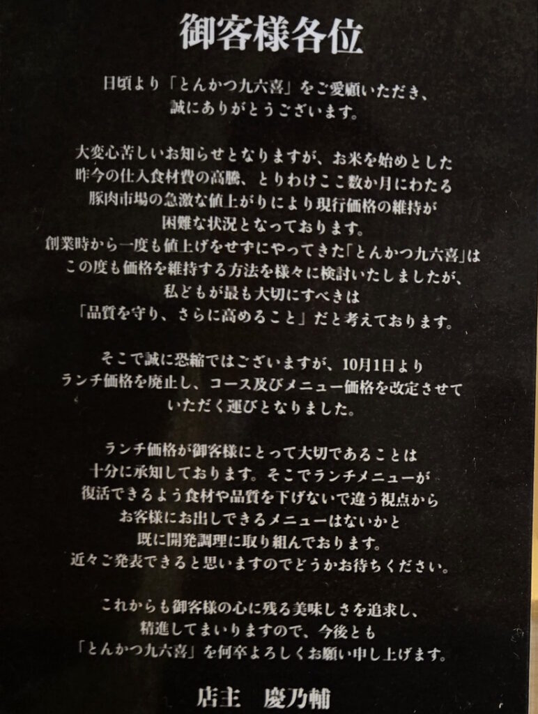 というわけで、気になっていたけど行けてなかった神保町の「とんかつ 九六喜」に、昨年のOPENから1年以上経ってやっとのことで初訪問♪