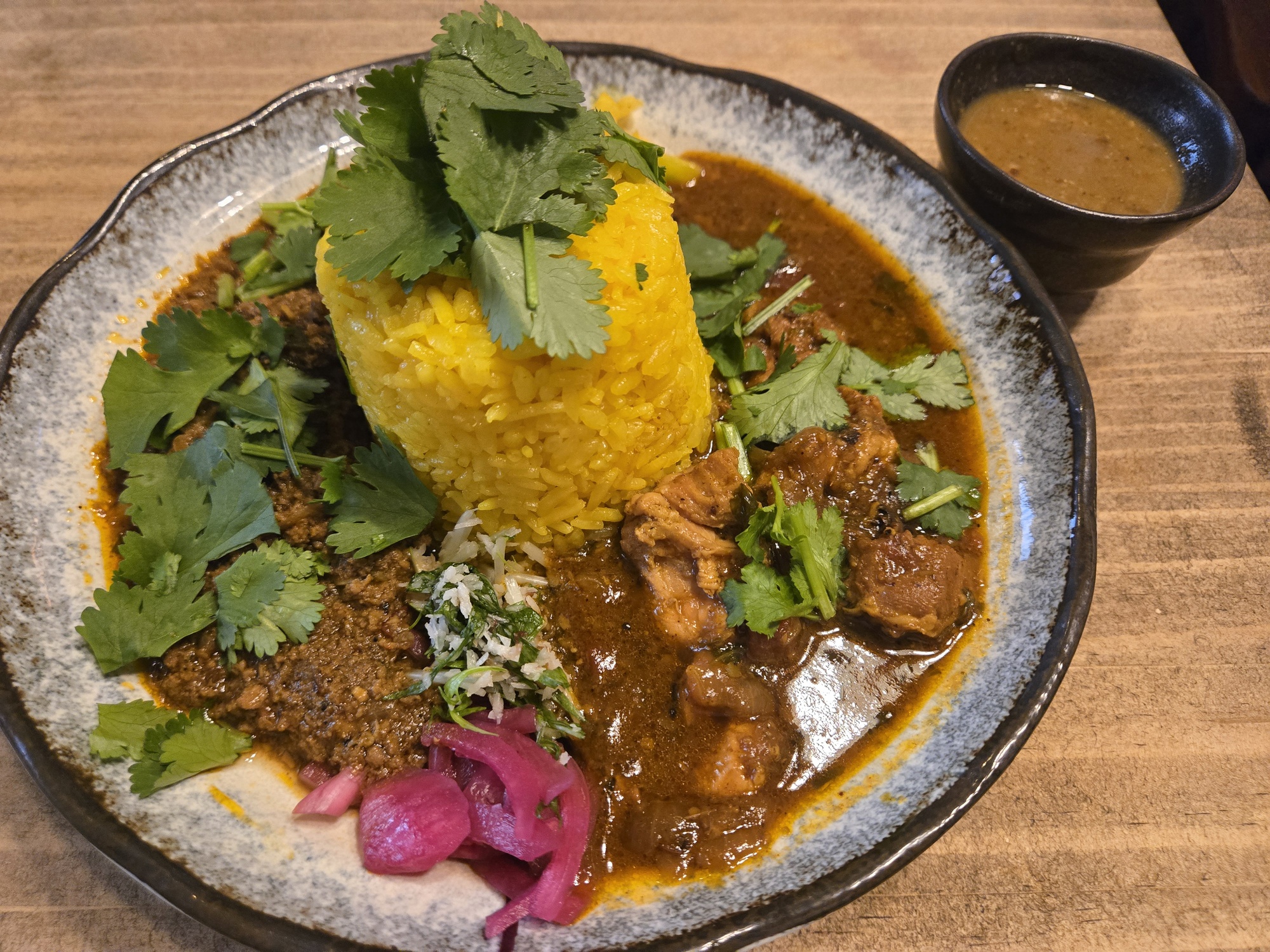 細長い硬めに炊かれたターメリックライスやタマネギのアチャール、パクチーなどの抜かりない感じも素晴らしく、最後はごちゃまぜにしてペロリと完食。