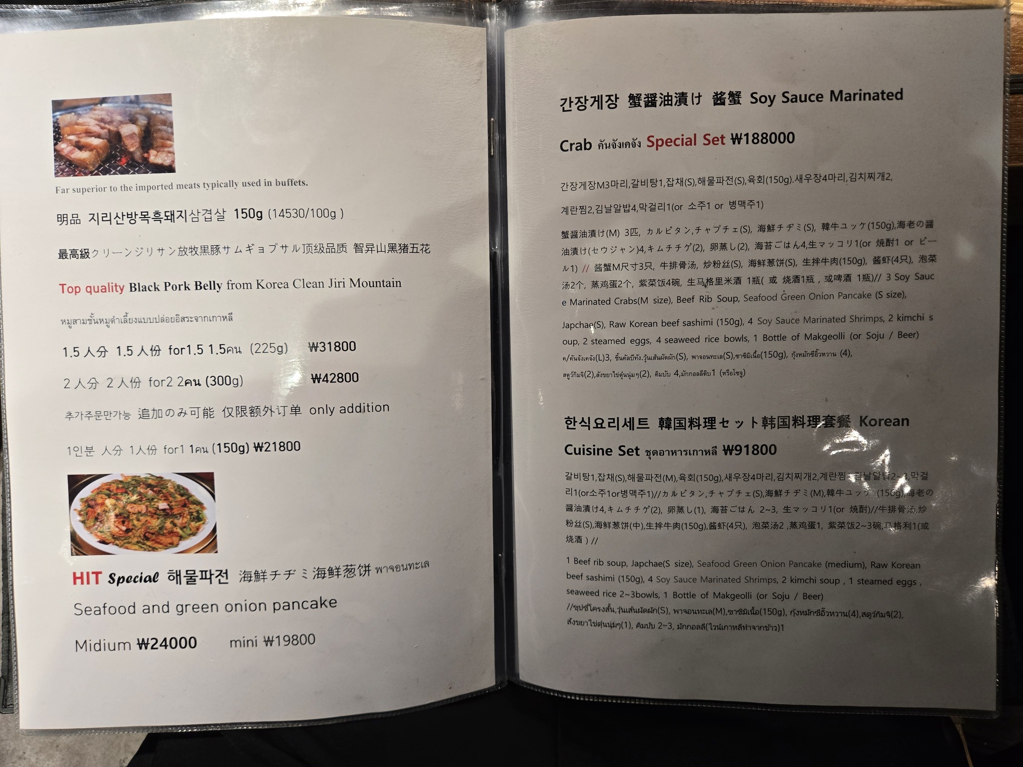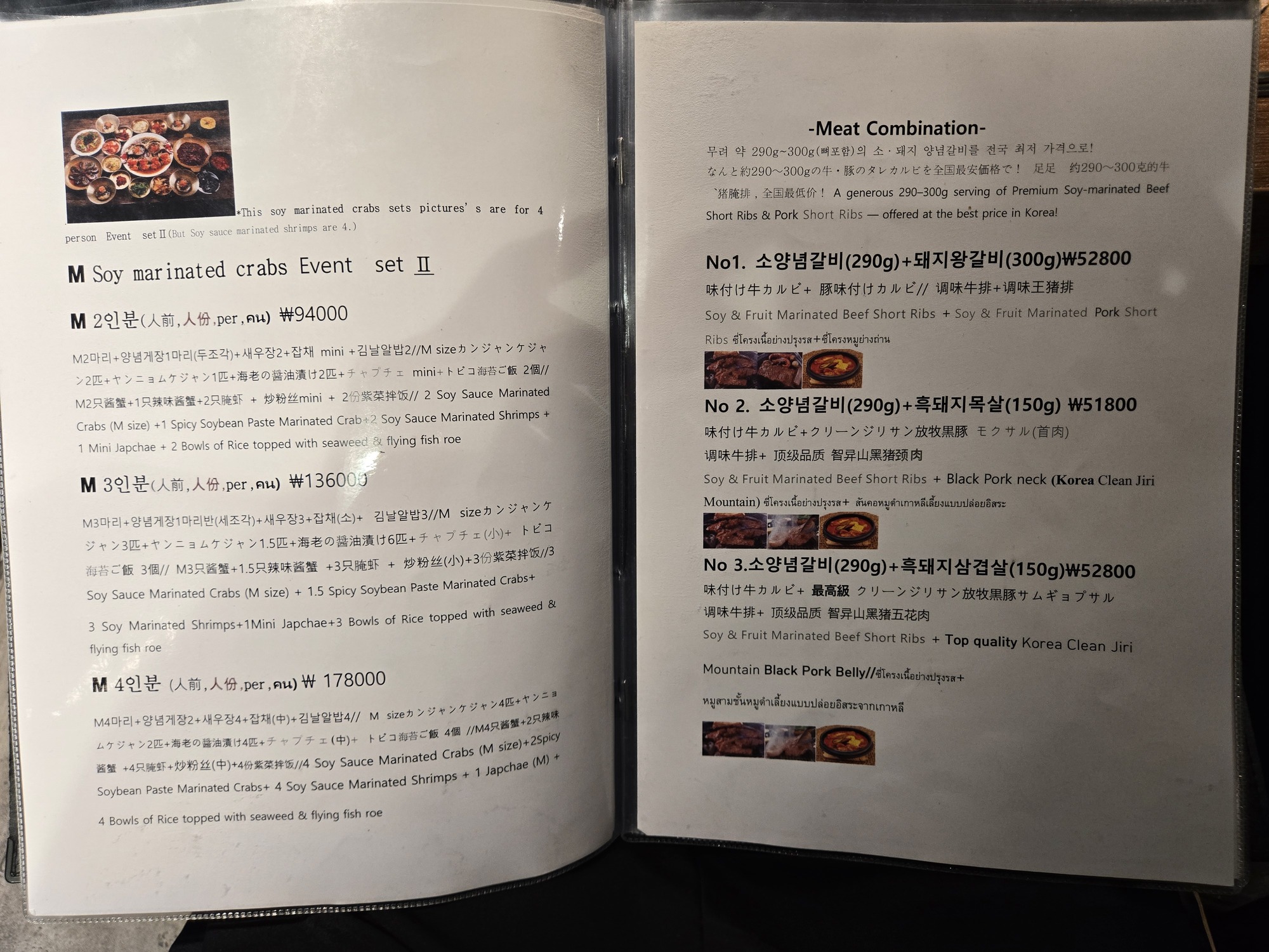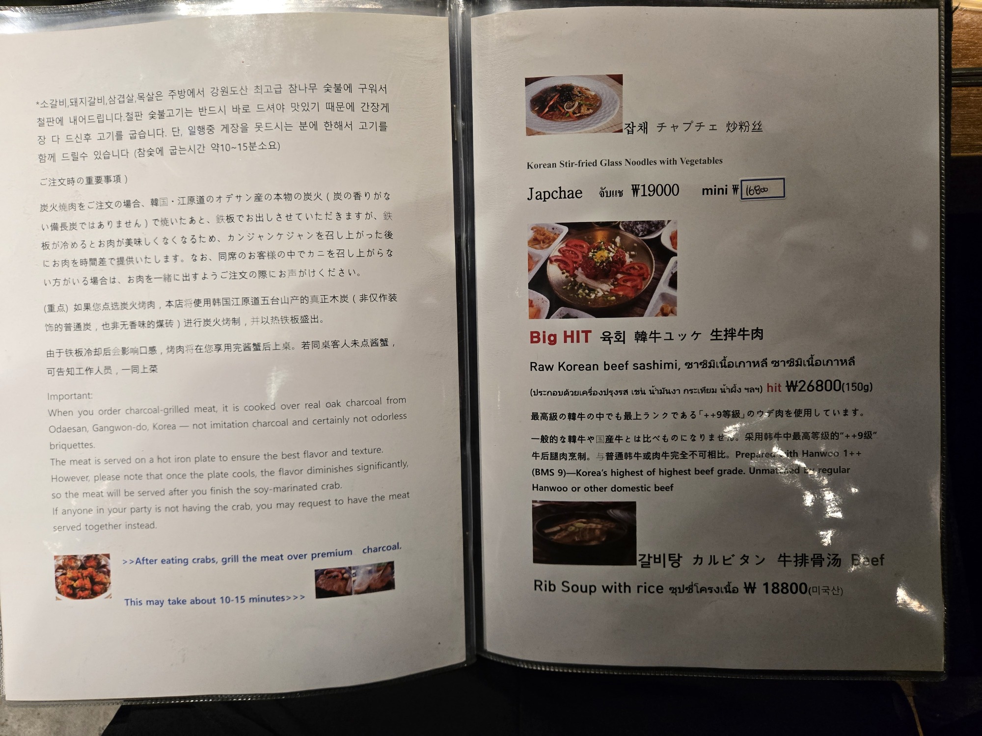 カンジャンケジャン(ワタリガニの醤油漬け定食)中心で、カニのサイズによって料金が変わるメニュー構成でした。我々はXXLサイズを注文しましたが、オススメはLサイズのようでした苦笑。