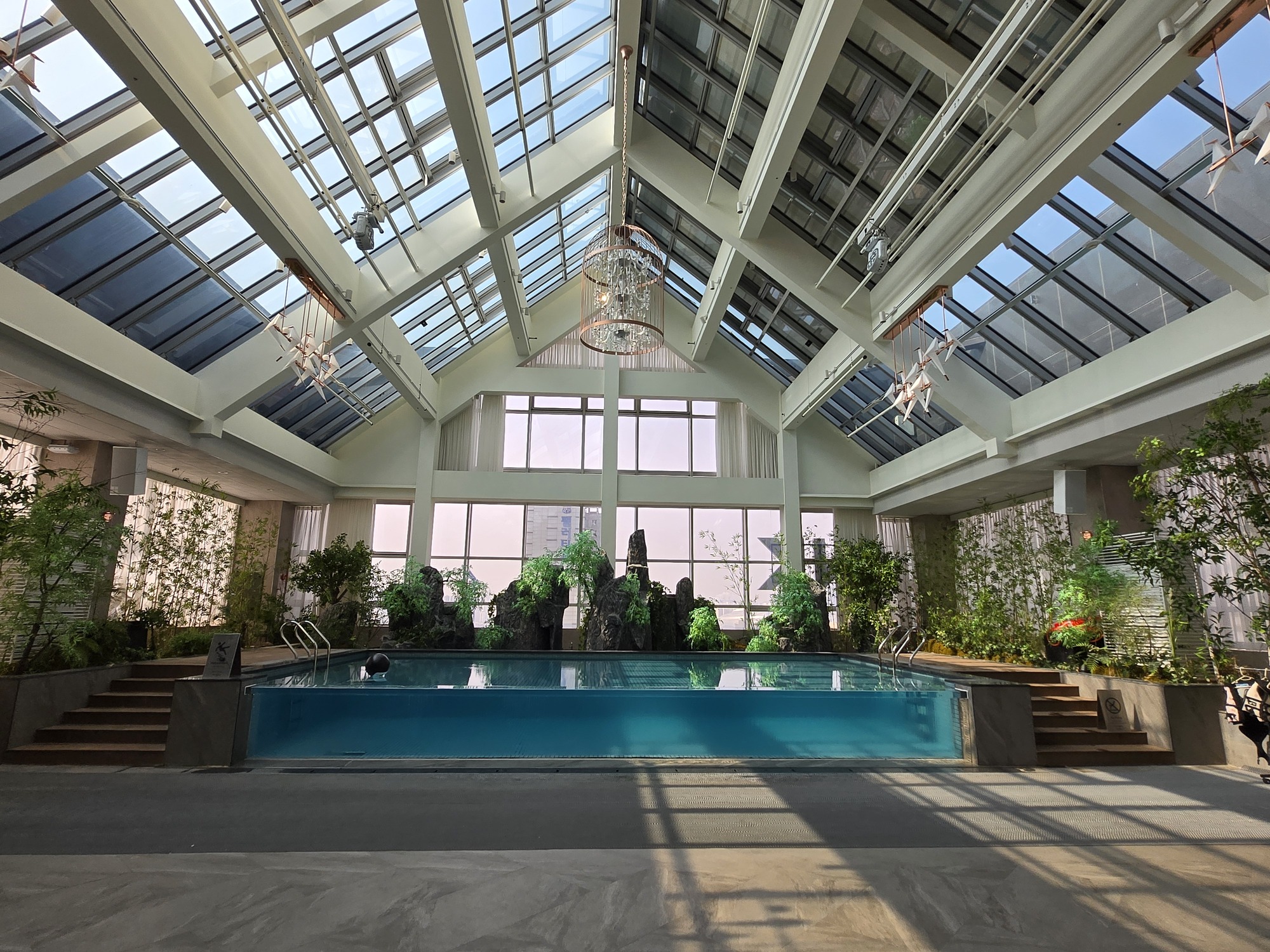 プールエリアは自然光が差し込む開放的な空間で広々としていて、緑もあってすごく気持ちよく過ごせます。