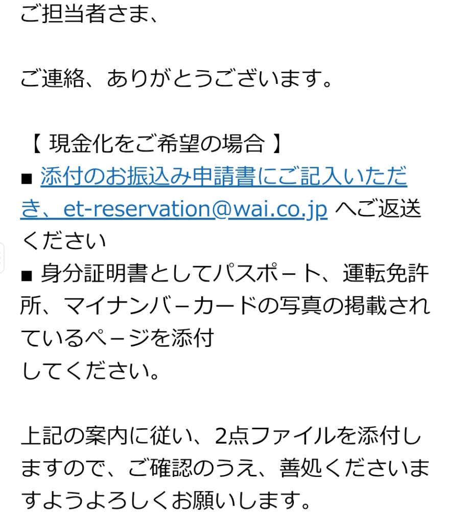 振込先口座を埋めたエクセルと身分証明書のキャプチャを添付して上記のメールで返信しました。