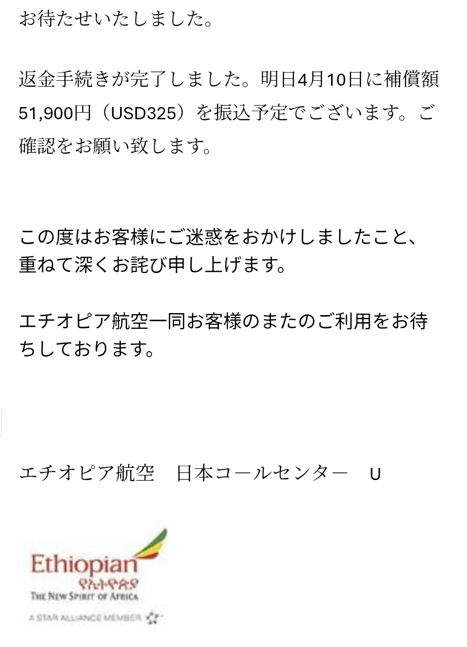 エチオピア航空からの補償金および差額返金のメール